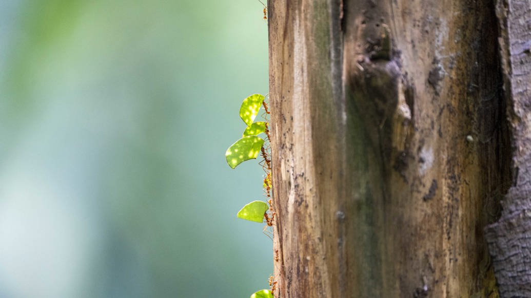 There are dozens of species of leafcutter ants in South America, spending their days transporting millions of tiny pieces of leaves and blossoms to their colony. There, they grow fungi on chewed plant material. The fungal threads are their main food. For the ant larvae, they are the only food. This form of horticulture by ants has evolved more than once; leafcutter ants come from two different biological genera. Yet, it occurs exclusively in (sub)tropical America; no leafcutter ants have been found in the wild on other continents. These little insects have perfected symbiosis, especially the species of the genus Atta, who now also live in the Bush. According to scientists, this collaboration began some three million years ago! Atta leafcutter ants and the fungus Leucoagaricus gongylophorus are fully dependent on each other.