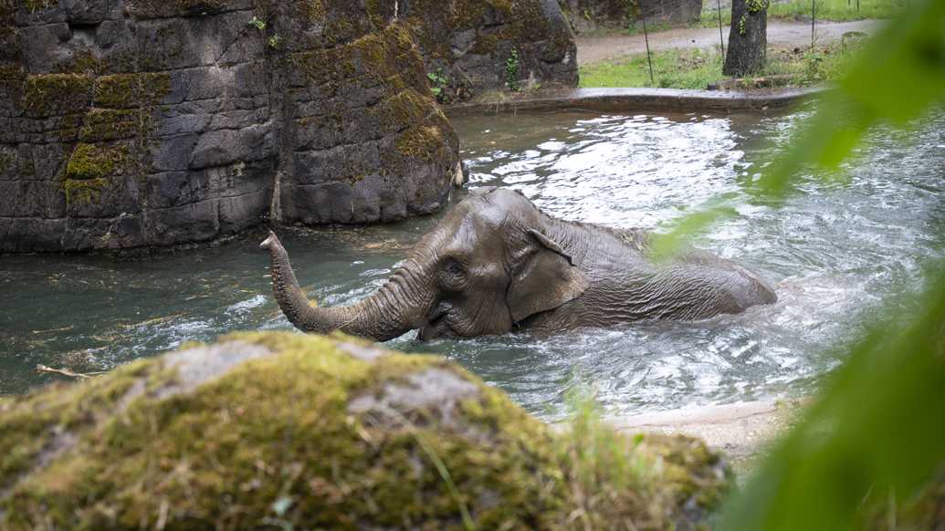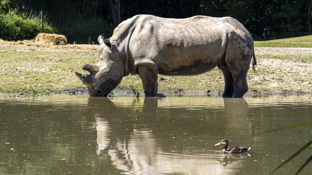 During prolonged temperature spikes, such as during a heat wave, many animal species seek cooling in their enclosures, and the zookeepers offer refreshing enrichment. Burgers' Zoo's Asian elephants take regular baths, and the zookeepers have installed a mud pool in the rhino enclosure where the thick-skinned animals can enjoy a cooling mud bath.