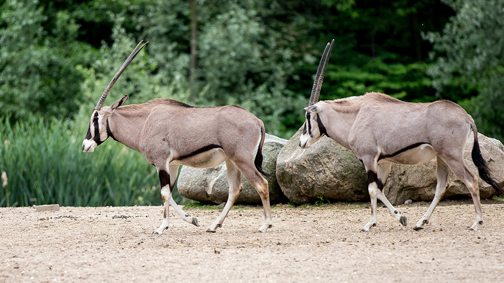 The Arnhem savannah is home to square-lipped rhinoceros, Rothschild giraffes, Grant's zebras, waterbucks, roan antelope, white-bearded wildebeest and East African oryx. Small elevations in the landscape allow animals to walk out of each other's sight, and metal poles separate the rhinoceros from the other ungulates halfway across the plain. Young rhinoceros sometimes pass between the poles, after which the mother often wriggles through with some difficulty. All the other hoofed animals have the entire plain at their disposal and use it.
